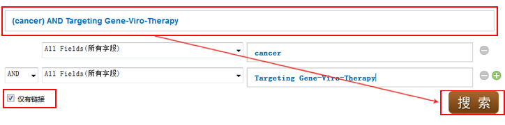 3.点击高级检索,进入高级检索页面,设定逻辑关系和限定字段,输入检索项,下边勾选是否有链接,点击检索既可以进行高级检索。如果你要进行更精确的检索,可以点击检索框后边的”+“号或者”——“号,增减检索所需要的限定项和字段,方便快捷。