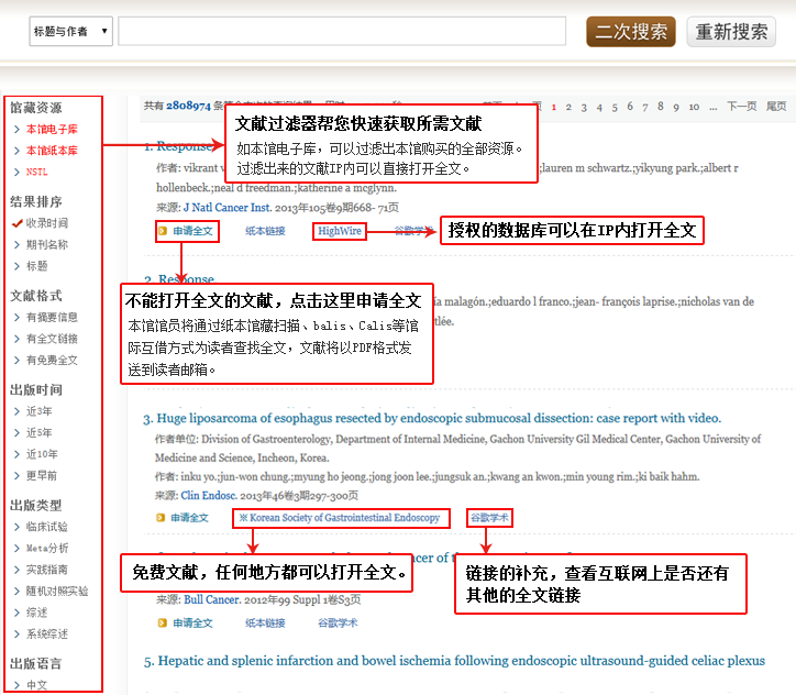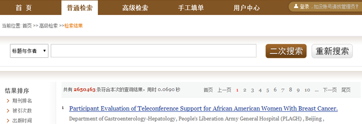 如何进行二次检索文献?在检索结果页的上部,有二次检索框,您可以输入检索词进行点击二次检索按钮进行二次检索;也可以点击后面重新检索按钮节能型重新检索。